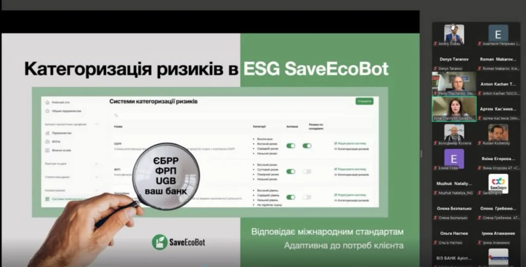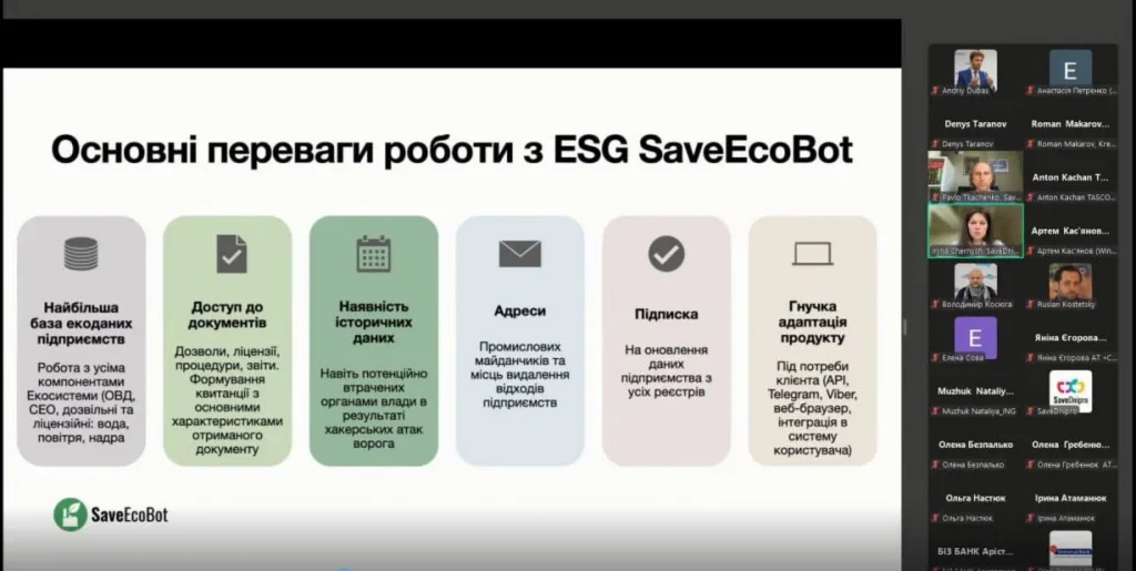 - Ірина Черниш та Павло Ткаченко, представники SaveEcoBot, провели демонстрацію ключових можливостей платформи та пояснили принципи функціонування ESG-аналізу на практиці.