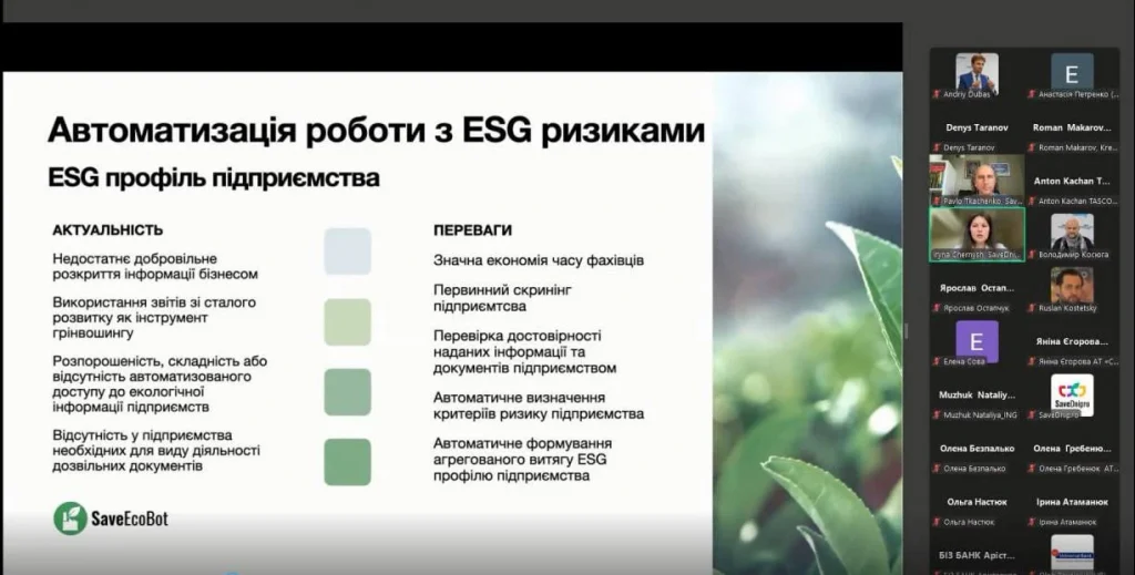 В умовах поточної війни та подальшої відбудови України, сталий розвиток та соціально-екологічна відповідальність набувають особливої актуальності для бізнес-середовища. Підприємства, що відповідають вимогам сталого розвитку, отримують переваги у вигляді вигідніших умов кредитування та співпраці з фінансовими установами. Водночас, банківський сектор стикається з необхідністю точної оцінки ризиків, що вимагає доступу до достовірних даних та автоматизованих рішень. Саме для цього спеціалісти ТОВ «Система екологічних даних» розробили аналітичну платформу SaveEcoBot, яка агрегує дані з державних реєстрів та дозволяє швидко сформувати ESG профіль підприємства.
